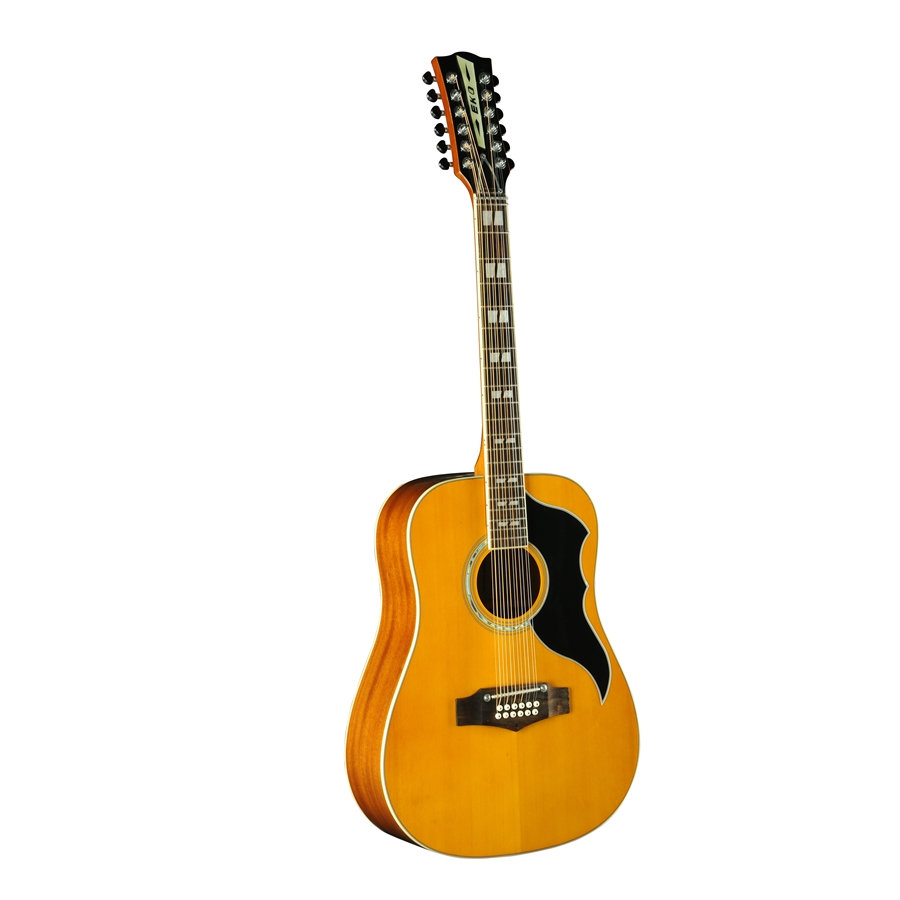 Eko Ranger XII VR Eq 12 corde risponde alla domanda di molti affezionati. Eko continua la tradizione della Ranger con la serie Vintage Reissue che prevede diverse caratteristiche dei modelli originali, come il manico bolt-on, selletta regolabile in alluminio, zero-fret e dot rettangolari.