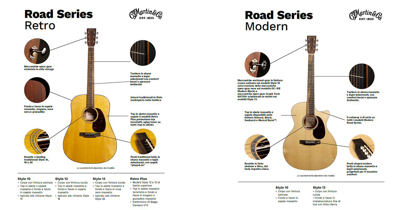 Modelli Retro: 000-10E Retro, 000-10EL Retro, 000-10E Retro Sapele, 000-10EL Retro Sapele, 000-12E Retro, 000-12EL Retro, 000-13E Retro Walnut, 000-13EL Retro Walnut, 000E Retro Plus Granadillo, DE Retro Plus Granadillo, DE-L Retro Plus Granadillo, D-10E Retro, D-10EL Retro, D-10E Retro Sapele, D-10EL Retro Sapele, D-12E Retro, D-12EL Retro, D-13E Retro Walnut, D-13EL Retro Walnut.