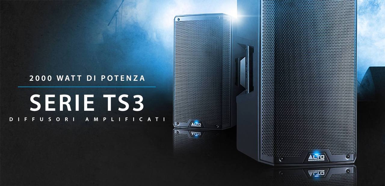 La serie di casse amplificate TS3 della Alto Professional, grazie alla bi-amplificazione da 2000 W di picco (1000 W continua), suddivisa in 1300 W sulle basse e 700 W sulle alte, e ai nuovi trasduttori rappresentano una soluzione professionale ed elegante che si presta a differenti installazioni: su stativo, sul palco, o sospese. La linea include anche 3 subwoofer amplificati (2000 Watt di picco; 1000 continui) da 12", 15" e 18".
