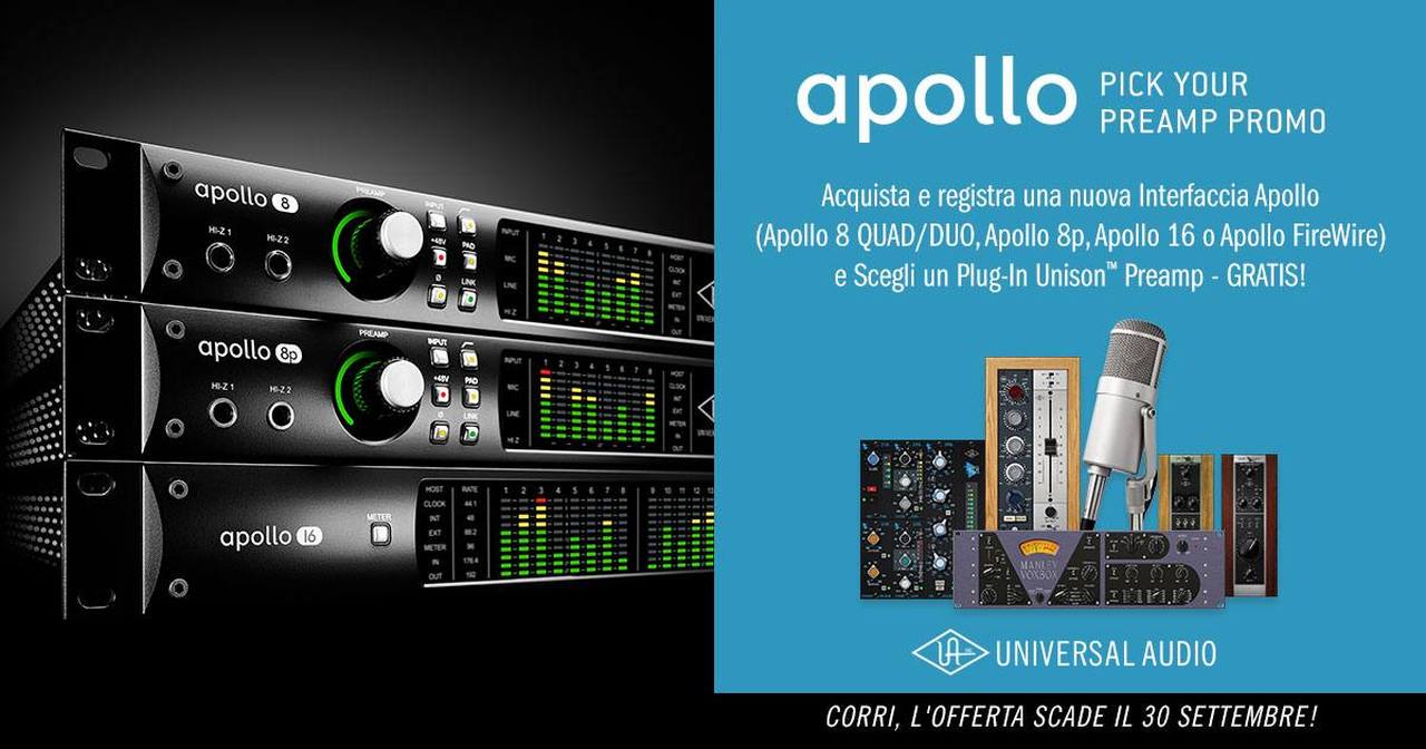 A Settembre 2016, acquista e registra qualunque nuova interfaccia Apollo Universal Audio rackmount (Apollo 8 QUAD/DUO, Apollo 8p, Apollo 16 o Apollo FireWire) potrai scegliere un plug-in Unison preamp... GRATIS!