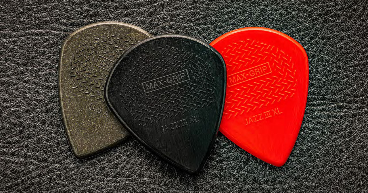 I nuovi Max-Grip Jazz III XL sono disponibili in tre versioni: Nylon, Carbon Fiber e Stiffo. Questi plettri combinano la velocità e il controllo della forma Jazz III, molto apprezzata dai solisti, alla presa salda dei Max-Grip che, insieme al formato XL, migliorano la presa. La versione Nylon, con il tipico colore rosso, porta con sé le caratteristiche sonore di questo materiale: elasticità e calore. I Carbon Fiber si distinguono per un attacco più aggressivo. Infine, i Black Stiffo, grazie alla formula di nylon più rigida con cui sono realizzati, producono un attacco più brillante con una resistenza ridotta, caratteristiche ideali per uno stile articolato ed energico.
