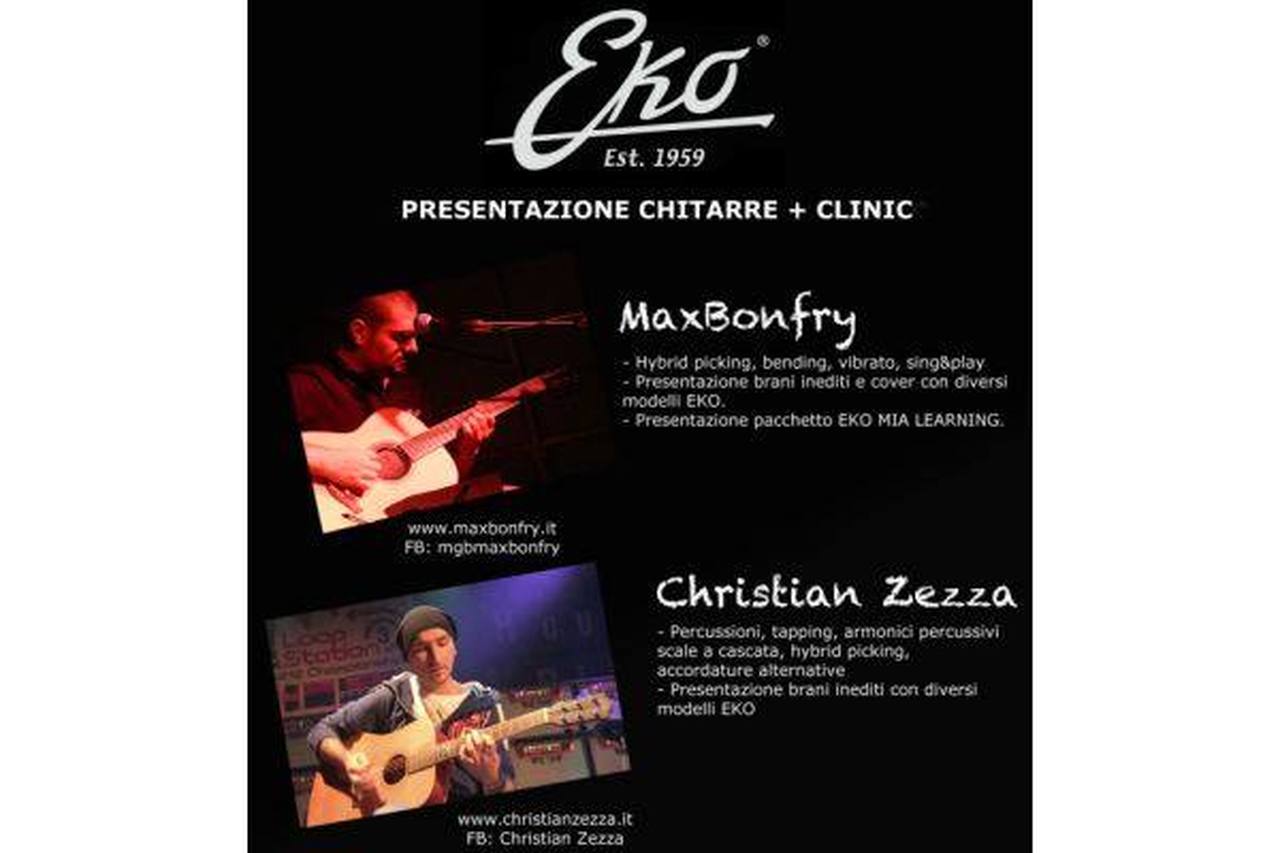 Max e Christian, entrambi dimostratori ed artisti del marchio Eko guitars, presentano presso i punti vendita e saloni di esposizione sul territorio nazionale un evento dimostrativo relativo alle chitarre acustiche Eko con il seguente programma: