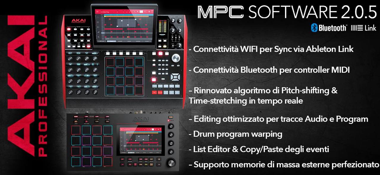 Akai Professional ha rilasciato un aggiornamento firmware per le DAW standalone MPC LIVE e MPC X distribuite in esclusiva per l’Italia dalla Eko Music Group Spa. L’update 2.0.5, scaricabile gratuitamente dalla sezione download delle pagine dedicate ai prodotti nel Akai Professional (MPC X: clicca qui; MPC LIVE: clicca qui) introduce: connettività Wireless e Bluetooth, rispettivamente dedicate alla sincronizzazione via Ableton Link e al collegamento di MIDI controller e di tastiere QWERTY senza fili, un algoritmo ottimizzato per il pitch-shifting e il time-stretching in tempo reale, fuzione copy/paste degli eventi nel Grid Editor, la nuova finestra List Editor, e tanto altro. Perfezionata l’interazione con memorie di massa esterne.
