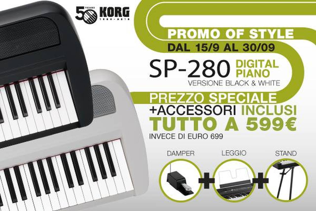Dal 15 al 30 settembre 2013, Korg lancia la "Promo of Style". Solo per pochissimi giorni puoi ottenere il piano digitale sp-280 e tutti i suoi accessori a 599 €.