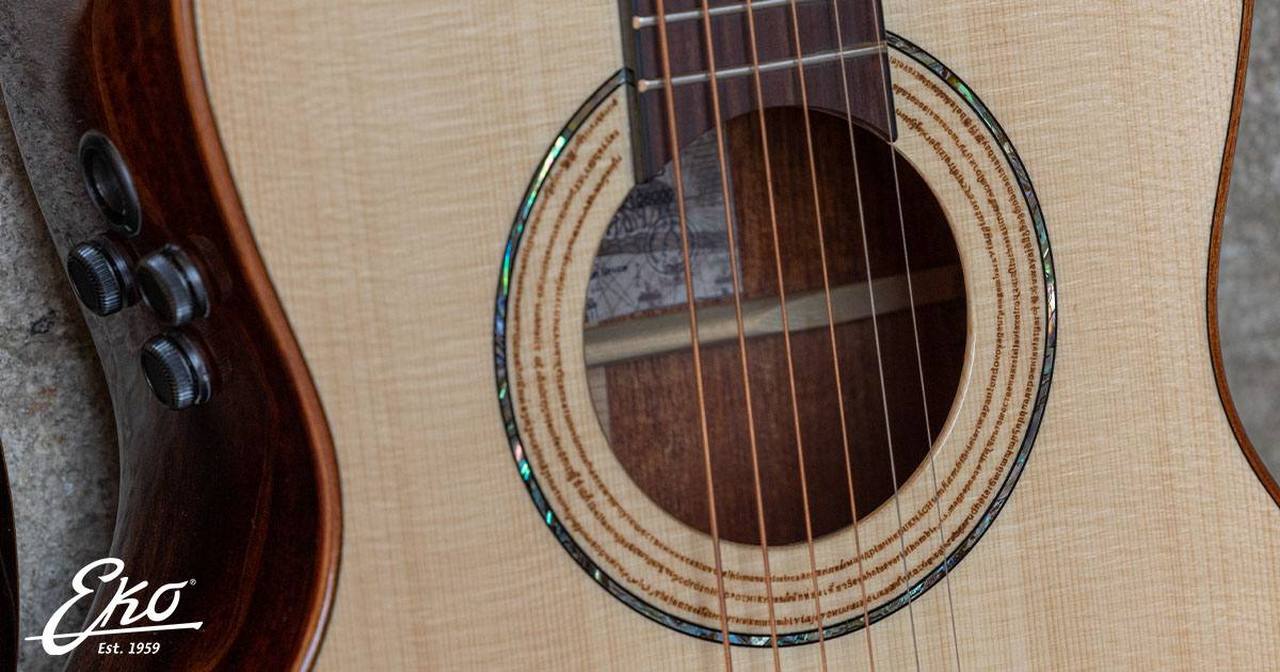 Dettaglio che rende uniche le Marco Polo di Eko Guitars è la rosetta, studiata per ospitare la parola viaggiatore incisa in tutte le lingue del mondo.