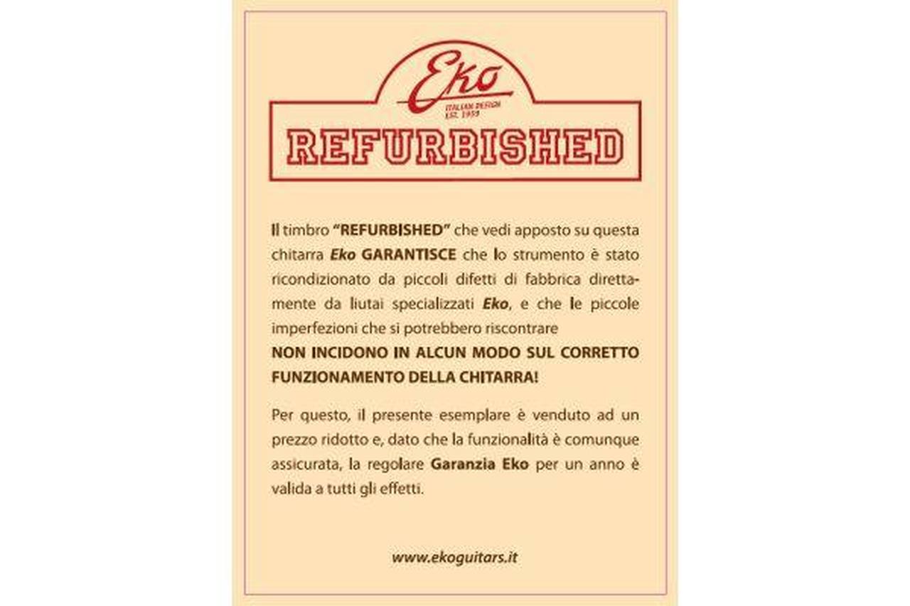 Tutte le chitarre Eko di “seconda scelta” da oggi avranno il timbro e l’adesivo “Refurbished” (come nell’immagine sopra). Queste chitarre ricondizionate avranno prezzo ridotto in quanto possono avere dei piccoli difetti estetici, ma ne saranno comunque garantite le funzionalità e la suonabilità. A dimostrazione che questi piccoli difetti non incidono in alcun modo sul corretto funzionamento della chitarra, la regolare garanzia Eko è valida a tutti gli effetti.
