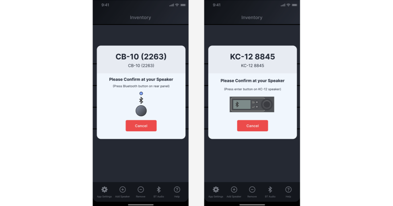 4) Ti verrà chiesto di confermare l'altoparlante a cui sei connesso premendo il pulsante sull'interfaccia utente posteriore degli altoparlanti, come indicato dall'app. Una volta confermato, un breve pop-up confermerà che l'altoparlante è stato aggiunto e potrai tornare alla schermata Inventario premendo il pulsante "Indietro" nell'angolo in alto a sinistra.