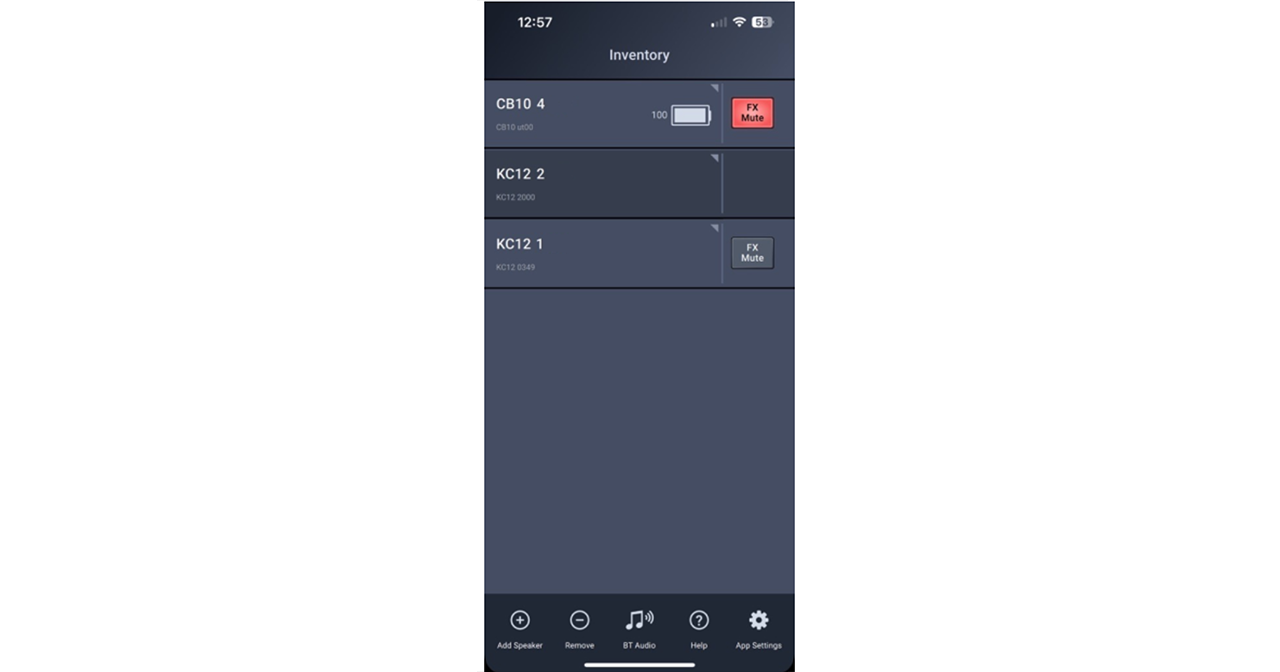 Inventory è la prima schermata che ci troveremo davanti una volta scaricata l'app. Da qui è possibile aggiungere o rimuovere un altoparlante dall'inventario, accedere e controllare gli speaker collegati o visualizzare quelli collegati in precedenza. Abbiamo anche a disposizione, nel caso del QSC CB10, un indicatore del livello della batteria e, per tutti i modelli, un controllo che ci consente di mutare rapidamente gli effetti applicati ai nostri speaker.