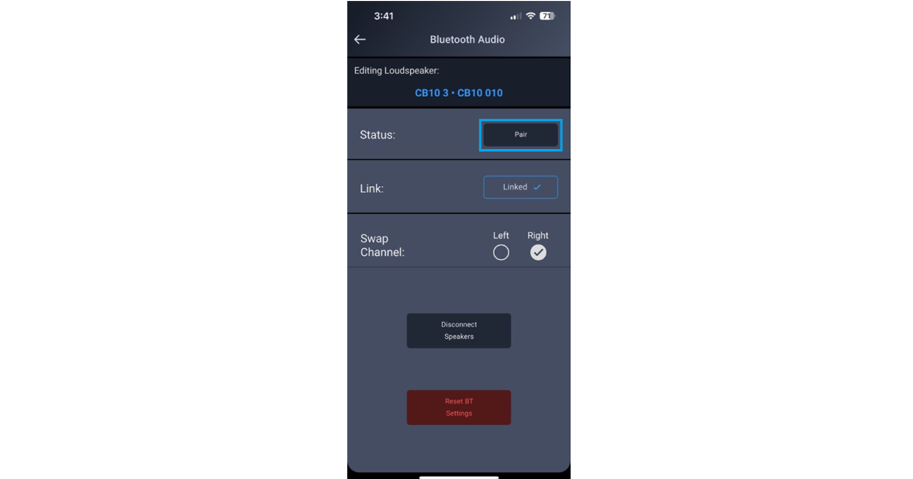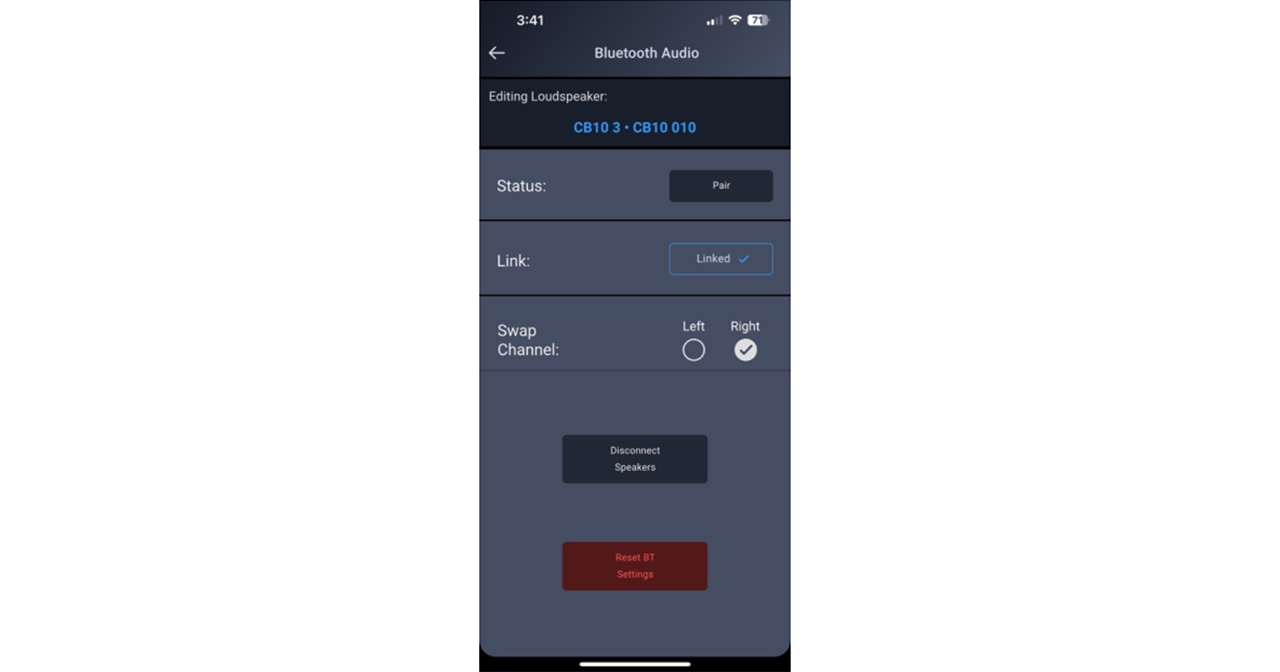 4b) Una volta che gli altoparlanti sono connessi, l'app 'Loudspeaker Control' mostrerà "Collegato" e sarà possibile assegnare all'altoparlante l'audio del canale stereo sinistro o destro. Se si cambia il canale audio su un altoparlante, la modifica verrà automaticamente applicata anche al secondo altoparlante collegato.