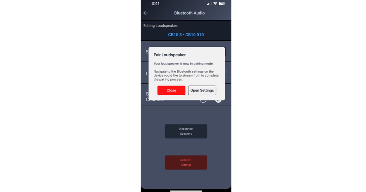 2c) Apparirà una finestra pop-up che ti permetterà di annullare la procedura o di aprire le Impostazioni del tuo dispositivo per accedere all'elenco delle connessioni Bluetooth. Premi "Apri Impostazioni" e segui la procedura per l'associazione al tuo dispositivo Bluetooth. Il nome dell'altoparlante apparirà nell'elenco dei dispositivi disponibili per la connessione. Una volta selezionato il dispositivo e effettuata la connessione, torna all'app Loudspeaker Control.