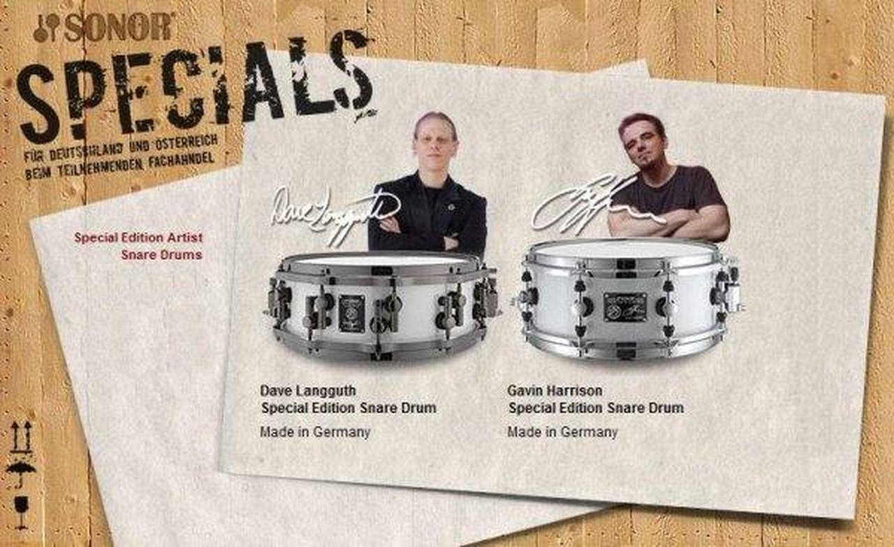 In occasione delle loro esibizioni tenutesi al Sonor DAYS 2010, Vi presentiamo la ricostruzione originale del rullante Gavin Harrison e Dave Langguth in serie esclusiva e limitata "Summer Specials". Entrambi i modelli sono stati utilizzati durante innumerevoli spettacoli dei Porcupine Tree e di Nelly Furtado.Ora anche questi rullanti vantano il pregio di fare parte del prestigioso Sonor "Made in Germany" Sound!