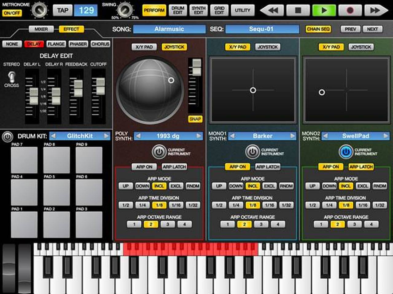 L’applicazione porta in ambiente Apple iOS uno strumento sullo stile delle groove box, drum machine hardware di una volta, e comprende un sequencer a 4 tracce, rispettivamente dedicate alla base ritmica e a 3 parti di sintetizzatore, di cui 1 polifonica e due monofoniche. Le novità principali nella nuova versione 3.0 riguardano proprio l’editing del synth, che dispone ora di un’interfaccia che permette un accesso rapido ad ogni singolo parametro, con un impatto visivo che nulla ha da invidiare ai virtual instruments disponibili su computer. Nella rinnovata finestra “Perform” sono visualizzati e modificabili tutti i parametri essenziali delle varie parti, dalla selezione del preset all’arpeggiatore, disponibile individualmente su ciascuna parte synth, dal mixer ai pad e alla tastiera touch per suonare le parti selezionate.