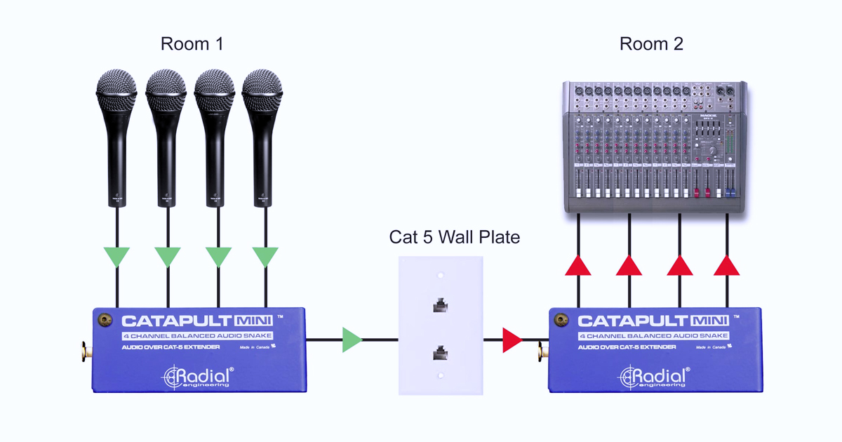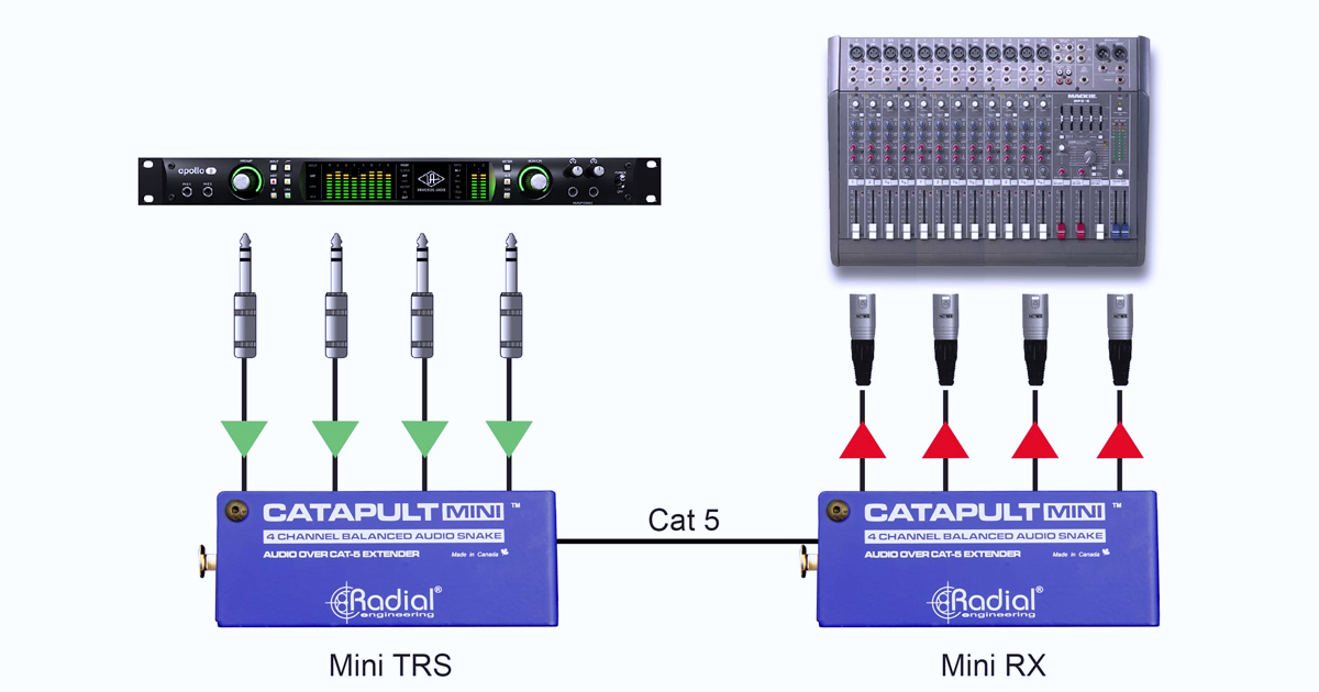 Il Mini TX e il Mini RX possono essere collegati direttamente tramite un unico cavo Cat 5, fornendo un collegamento audio analogico a 4 canali in grado di trasmettere segnali bilanciati su lunghe distanze mantenendo un'elevata qualità audio.