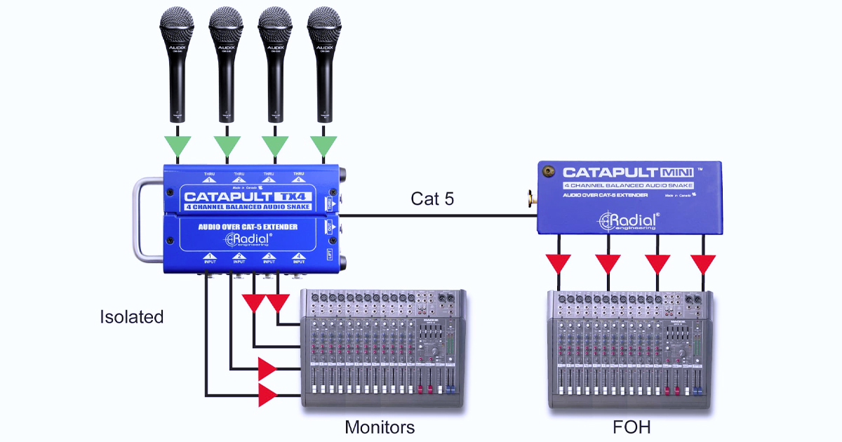 È possibile utilizzare Catapult TX4 insieme al Mini RX per inviare segnali audio dal palco alla console FOH. Il Catapult TX4 funge da stage box al quale collegare i microfoni, mentre il Mini RX è così compatto da poter essere riposto nella custodia di un mixer, con i suoi connettori di uscita XLR pronti per il collegamento diretto. Se sul palco è necessario dividere i segnali, si possono impiegare i moduli Catapult con isolamento tramite trasformatore: il TX4M per segnali a livello microfonico oppure il TX4L per segnali a livello di linea.