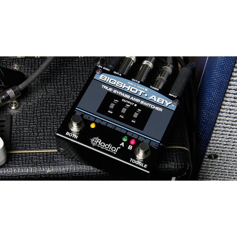 Radial BigShot ABY switcher true-bypass ABY compatto è interamente passivo: il timbro dello strumento non viene influenzato da alcun buffer posto tra chitarra e amplificatore. BigShot ABY è dotato inoltre di una uscita Tuner separata 'always on' (sempre attiva) che invia il segnale della vostra chitarra ad un accordatore per il monitoraggio costante, mantenendolo fuori della catena del segnale. In caso di problemi di ronzio e rumore causati dai loop di massa, BigShot ABY vi aiuta con un interruttore per il trasformatore di isolamento integrato e un interruttore ground-lift. Una volta inserito, è possibile invertire la polarità del secondo amplificatore per garantire che entrambi gli amplificatori suonino in fase. BigShot ABY è semplice da usare ed efficace sul palco. Se alimentato da un alimentatore da 9V esterno o un power-brick da pedaliera, i LED super-luminosi prendono vita fornendovi una lettura immediata dello stato dell'amplificatore sul palco. Quando l'alimentazione non è disponibile, il percorso del segnale audio passivo funziona comunque. Il design compatto ed estremamente robusto rende BigShot ABY ideale per pedaliere molto articolate.
