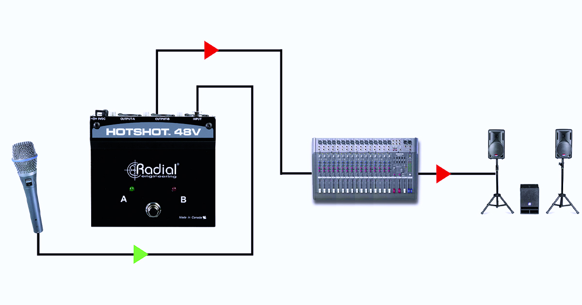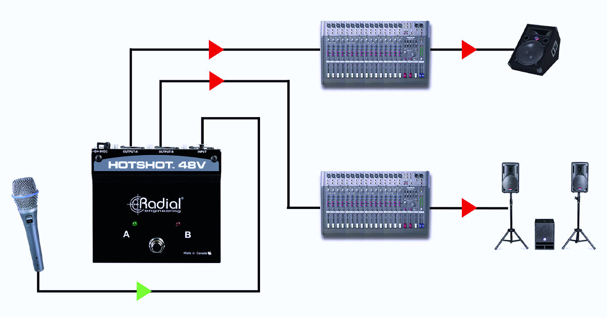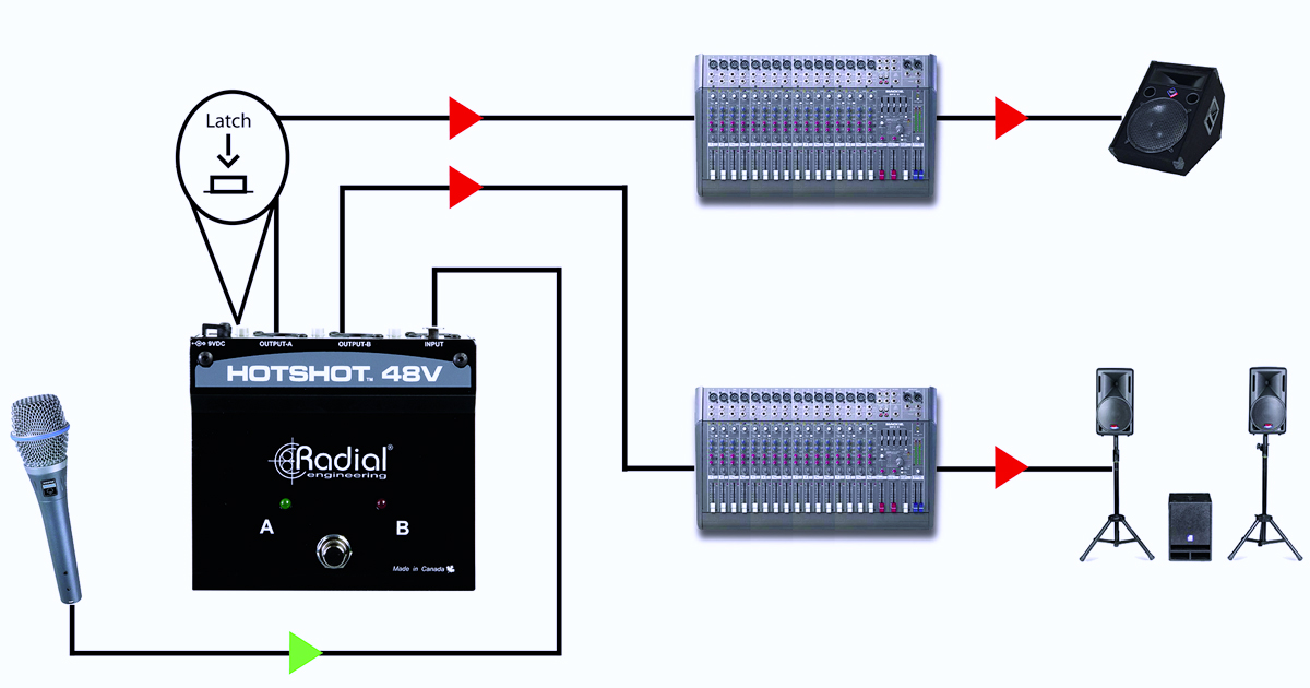 Collegando l'HotShot 48V a un microfono l'artista sul palco può facilmente e silenziosamente reindirizzare il segnale per comunicare con i membri della band o i tecnici senza interrompere l'esibizione. È sufficiente premere l'interruttore a pedale per silenziare il segnale all'impianto PA e inviare il segnale del microfono vocale direttamente alla band.