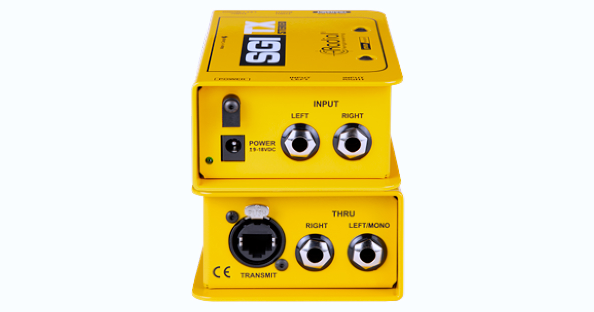 Il sistema SGI Stereo è uno dispositivo estremamente utile per gestire configurazioni articolate dal vivo. Puoi, ad esempio, utilizzare un SGI tradizionale per portare il segnale da un ricevitore wireless al pedalboard, quindi impiegare una coppia di SGI Stereo per inviare l’uscita stereo del pedalboard verso amplificatori remoti, mantenendo un segnale stabile e silenzioso fino a 100 metri (300 ft) di distanza.