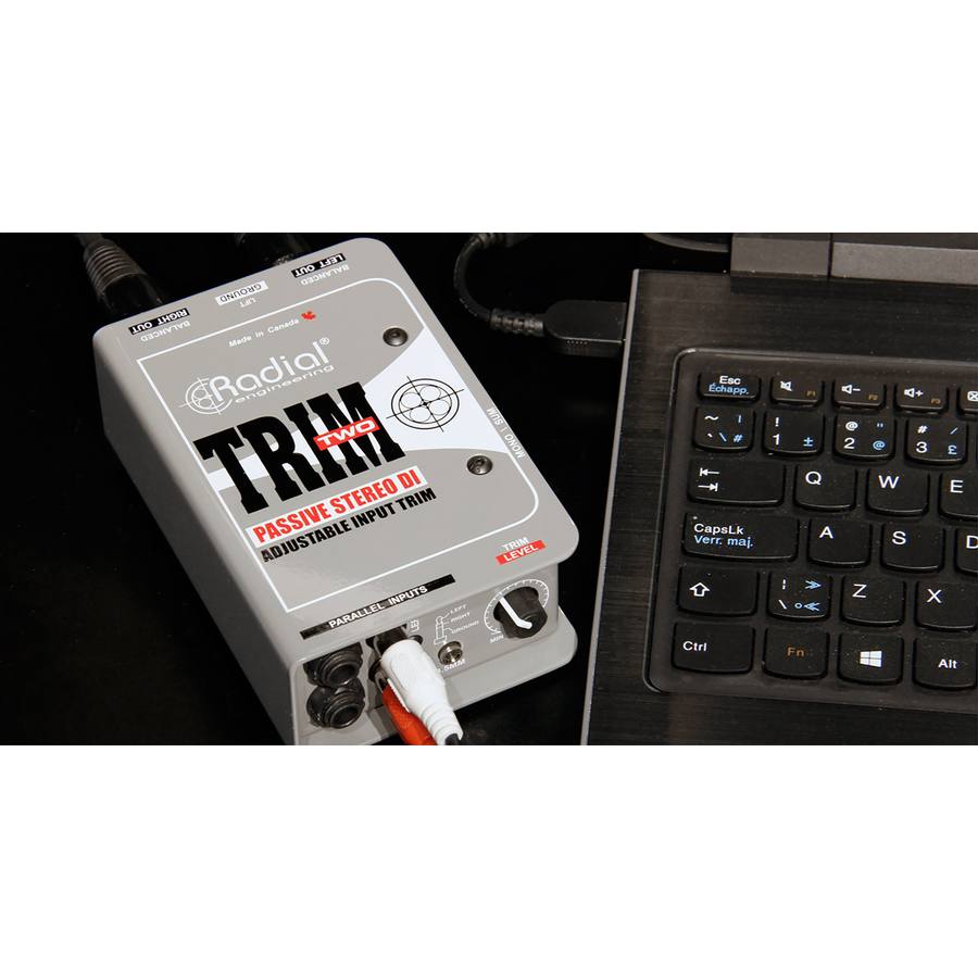 Trim-Two, un isolatore stereo passivo progettato per semplificare l'utilizzo del computer portatile per tastieristi, DJ e presentatori AV attraverso un controllo volume ad accesso rapido per regolazioni immediate durante le performance live.
