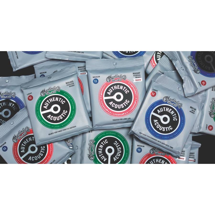 Le corde per chitarra acustica MA140T di Martin & Co della serie Authentic Acoustic Lifespan® 2.0 sono le corde che sfruttano una nuova tecnologia brevettata da Martin dopo due anni di ricerca e sperimentazione. Un nuovo metodo studiato per proteggere il filo centrale e l'avvolgimento esterno prevenendo la corrosione senza compromettere il timbro del tuo strumento. Le corde della serie Lifespan® 2.0 offrono un'esperienza tattile fluida riducendo l'attrito fra dita e corda. Ultra durature ed equilibrate, garantiscono un timbro genuino, stabililità di accordatura e grande suonabilità. MA140T in scalatura Light con avvolgimento in Bronzo 80/20, presentano i seguenti diametri: 12-16-25-32-42-54