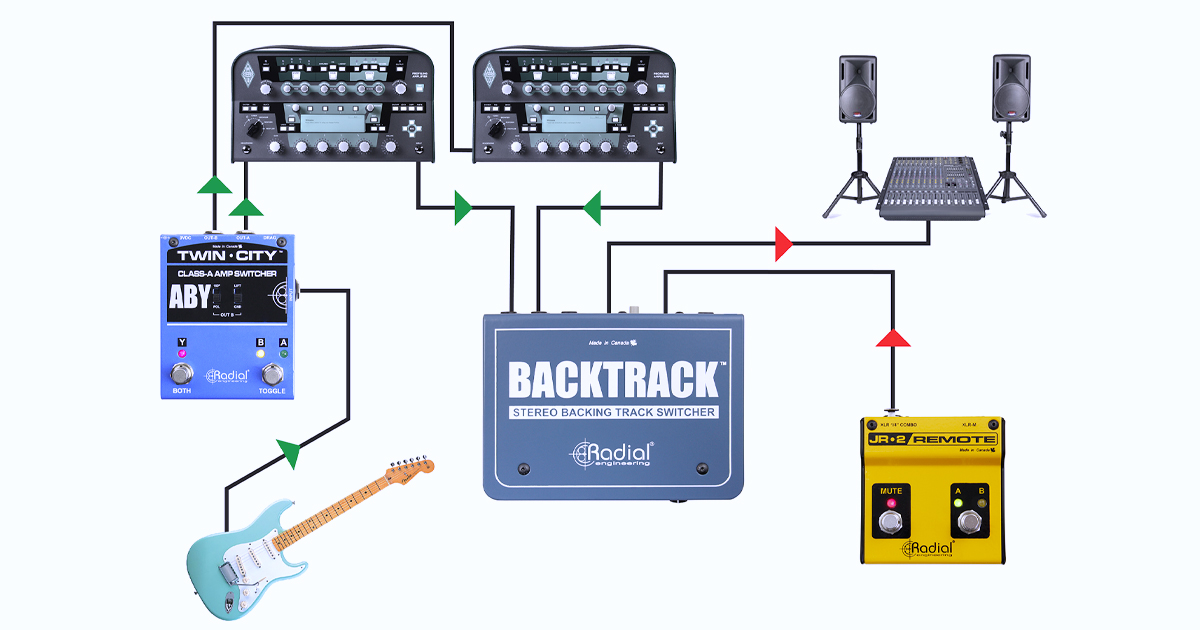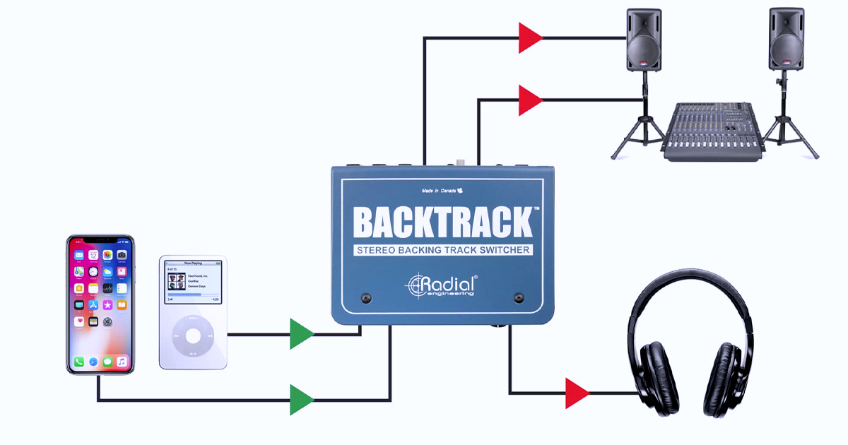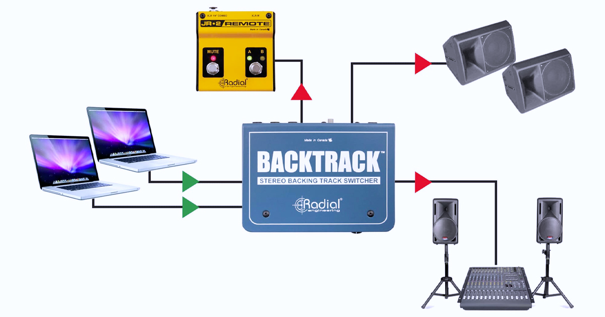 Backtrack è progettato per garantire continuità e controllo sulle sorgenti audio stereo in situazioni dove la stabilità è cruciale, come performance con backing track, presentazioni o sistemi di intrattenimento live. La commutazione tra due sorgenti stereo avviene tramite il selettore A/B, con possibilità di comando remoto tramite pedale JR-2 (non incluso), permettendo la selezione rapida della sorgente attiva senza interrompere il segnale inviato al sistema PA o ai monitor.