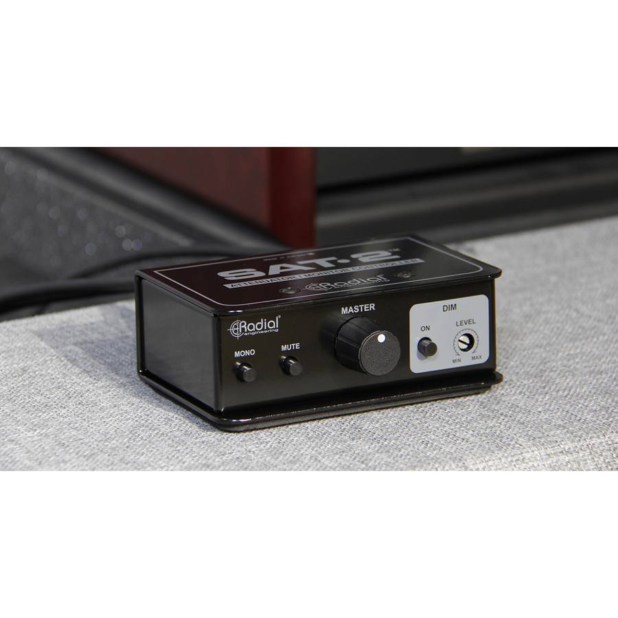 Per utilizzare SAT-2 come controller per monitor, è sufficiente collegarlo tra il dispositivo di riproduzione o l'interfaccia di registrazione e un paio di diffusori attivi. SAT-2 è ugualmente utile in uno studio di registrazione o con un semplice impianto di amplificazione per controllare i livelli di uscita generali. Sono disponibili per gli ingressi di SAT-2 entrambe le opzioni XLR e ¼" TRS, che eliminano la necessità di cavi adattatori. Le uscite XLR si collegano ai diffusori, mentre la manopola Trim offre un controllo del volume principale di facile accesso. Gli interruttori Mute e Mono permettono di disattivare le uscite o sommare sinistra e destra insieme per controllare i mix per la compatibilità Mono-fase. Un pratico interruttore Bright con controllo di livello regolabile consente di abbassare temporaneamente il volume di uscita senza perdere l'impostazione sul controllo Trim principale.