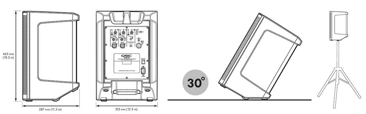 Il QSC CB10 è stato studiato per la massima portabilità e maneggevolezza, senza andarne a sacrificare le prestazioni. La sua batteria garantisce una durata di funzionamento di 12 ore ed impiega 4 ore per una ricarica completa, è dotato di una porta di connessione IEC per poterlo collegare alla rete elettrica e per ricaricare la batteria.