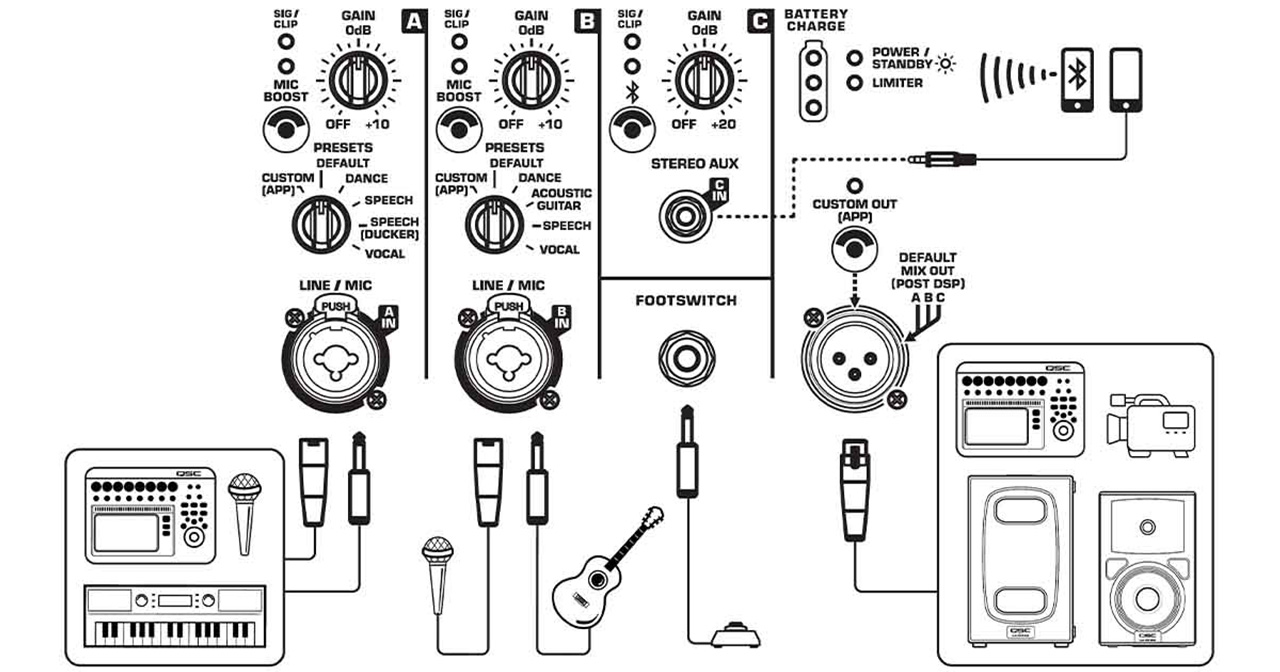 QSC CB10 è uno speaker attivo portatile, alimentato a batteria con un amplificatore in classe D da 440W, un woofer da 10” e 1 tweeter a compressione da 1”. Il range di frequenze che copre va da (-6dB) 47Hz a 20kHz per un massimo di 127 dBSPL a 1m di distanza. Dotato di 2 ingressi combo XLR/jack d ¼” che accettano segnale di linea o microfonico, un ingresso mini-jack da 3,5mm stereo e un’uscita Mix Out su XLR. La connessione Bluetooth 5.1 ci consente il controllo da remoto e il passaggio di segnale audio con opzione True Wireless Stereo per linkare più speaker, è possibile selezionare dei preset di funzionamento direttamente dal pannello posteriore, mentre le funzioni più avanzate del DSP sono tutte controllabili da remoto grazie all’app QSC (iOS e Android) Loudspeaker Control App.