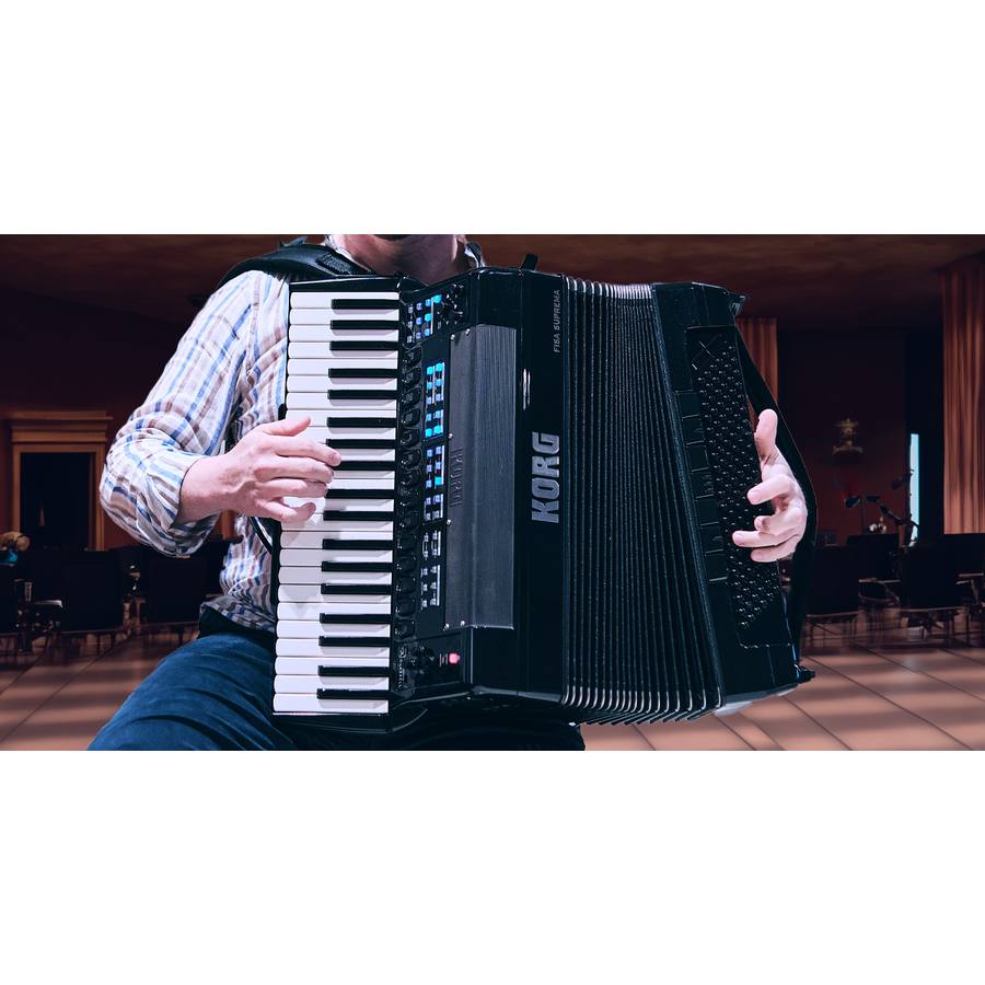 KORG FISA SUPREMA PIANO MBK è una rivoluzionaria fisarmonica digitale che fonde tradizione artigianale e tecnologia avanzata. FISA SUPREMA PIANO MBK offre la sensazione di suonare un'autentica fisarmonica 120 bassi, grazie all’emulazione per modellazione fisica di 45 diversi tipi di fisarmoniche acustiche a cui si aggiunge un’ampia libreria sonora con varie famiglie timbriche, controllate espressivamente dalla risposta del mantice come sullo strumento reale. FISA SUPREMA PIANO MBK è dotata inoltre di un efficiente sistema d'amplificazione interno stereo e di duplice alimentazione: tramite adattatore AC oppure batteria ricaricabile con 9 ore di autonomia.