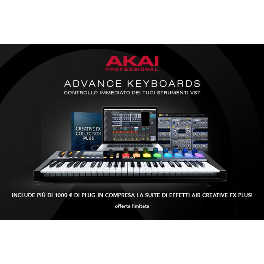Acquistando le tastiere Akai Professional Advance 25, Advance 49 e Advance 61 potrai scaricare - previa registrazione del prodotto sul sito Akai Pro - un pacchetto di strumenti virtuali e samples da circa 16GB, con oltre 10000 suoni pronti all'uso: Vacuum Pro, Loom, Hybrid 3, Xpand2, Velvet e Transfuser della AIR Music Technology, Eighty Eight Ensemble della SONiVOX e librerie di campioni prodotte dalla Toolroom Records.
