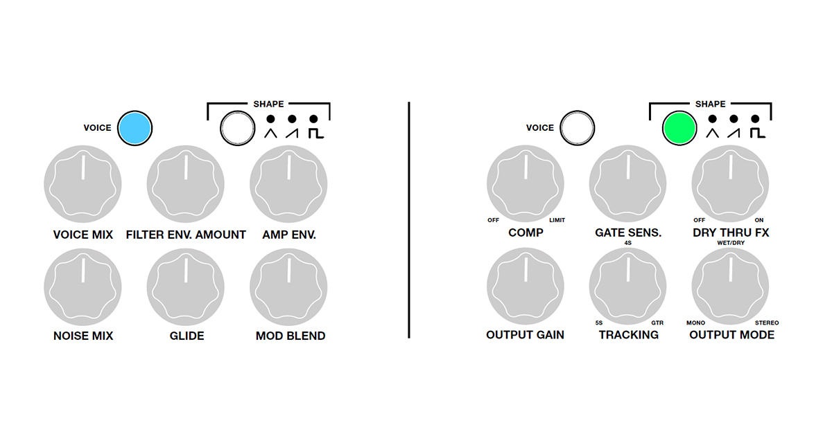 Tenendo premuto i tasti VOICE o SHAPE mentre si regolano gli altri controlli permette di accetere a parametri alternativi. I parametri accessibili tenendo premuto il tasto VOICE sono relativi al suono della patch del synth. Ognuno può essere salvato in un preset e controllato con un pedale di espressione. I parametri accessibili tenendo premuto il tasto SHAPE sono per la maggior parte impostazioni di utilizzo piuttosto che effetti. Nessuno di questi ultimi può essere controllato tramite pedale di espressione. Alcuni di loro sono parametri globali e riguardano tutti i preset.