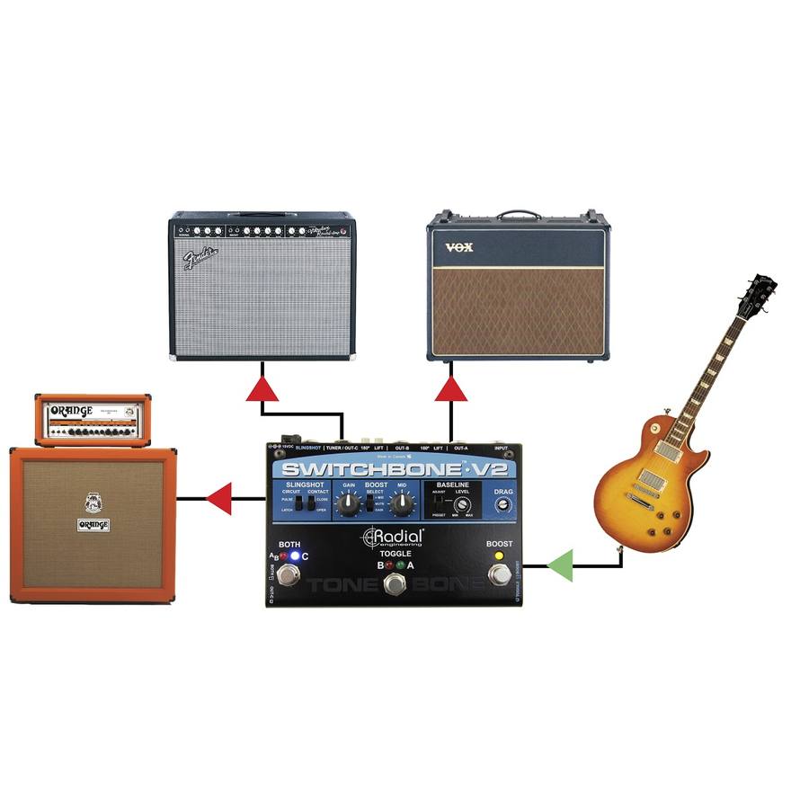 A differenza di altri switcher che bufferizzano il segnale attraverso circuiti integrati, Switchbone è caratterizzato da un circuito audio pluripremiato Radial in Classe A con tutti i componenti 100% discreti. I circuiti in Classe A sono preferiti dagli audiofili e dai chitarristi per la purezza del percorso del segnale, e per il suono caldo e ricco di armoniche che essi producono. Un controllo di correzione del carico Drag™ consente di 'regolare' il timbro e il tocco come se foste collegati direttamente al vostro amplificatore. Questa combinazione intelligente riduce l'impedenza consentendo l’utilizzo di cavi lunghi fino a 15 metri senza la suscettibilità al rumore che si verifica di solito con i cavi coassiali standard. Per eliminare il classico e fastidioso rumore di commutazione causato da pedali meccanici e relè, Switchbone impiega accoppiatori ottici ad alte prestazioni che utilizzano essenzialmente la luce per inviare e ricevere i comandi. Questi dispositivi incrementano o decrementano il segnale per una commutazione regolare e controllata anche con amplificatori high-gain. Per eliminare i ronzii e fruscii comuni in altri switcher, Switchbone V2 è dotato di uscite isolate da trasformatore e di interruttori Ground-lift che abbattono ulteriormente il rumore. Gli interruttori per l’inversione di polarità sulle uscite B e C permettono di mettere in fase tutti gli amplificatori.