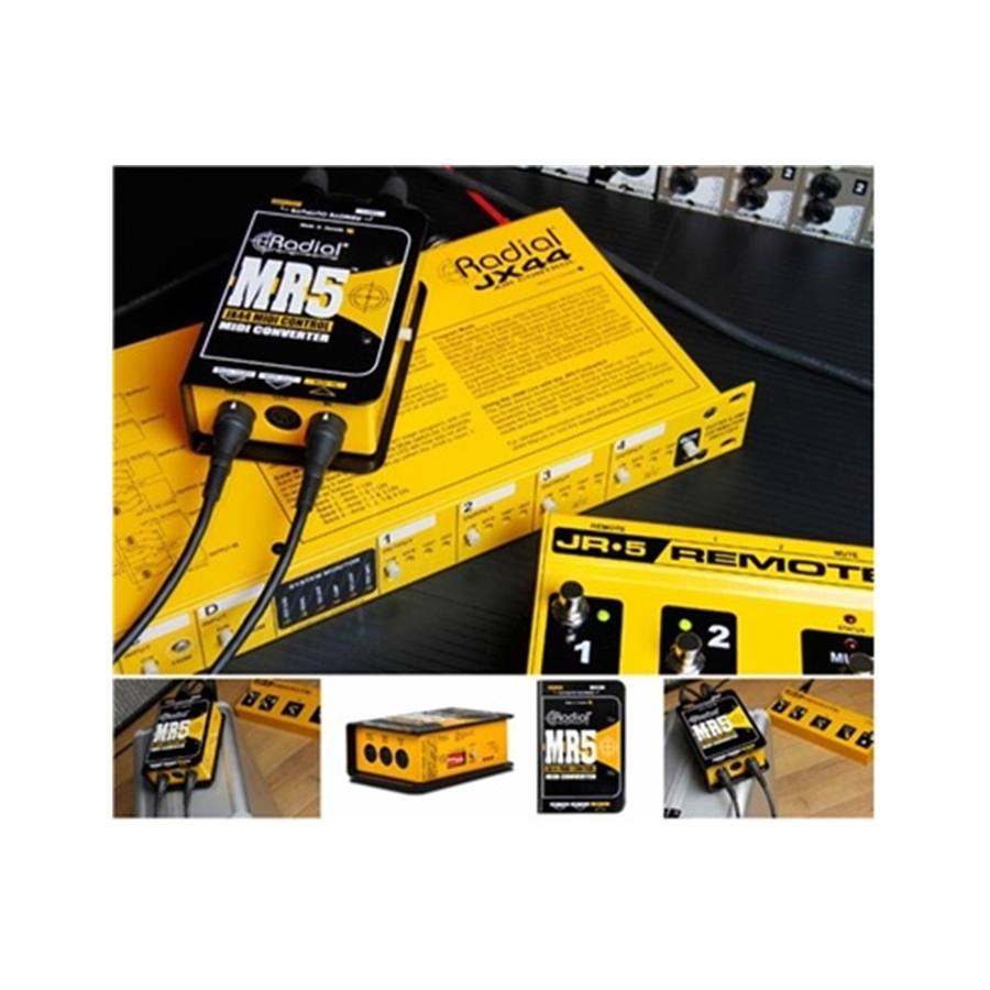 Radial MR5 è un traduttore di segnale MIDI che consente di utilizzare un controller MIDI per gestire i dispositivi JX44, JX42 e altri prodotti Radial che utilizzano la pedaliera JR5. Equipaggiato con prese MIDI IN, OUT e THRU, MR5 converte il flusso dei dati MIDI provenienti dal controller in un formato dati utilizzato da JR5. Questo viene poi inviato al dispositivo Radial ricevente tramite prese XLR per controllare a distanza ingressi attivi, uscite o altre funzioni accessibili da remoto.