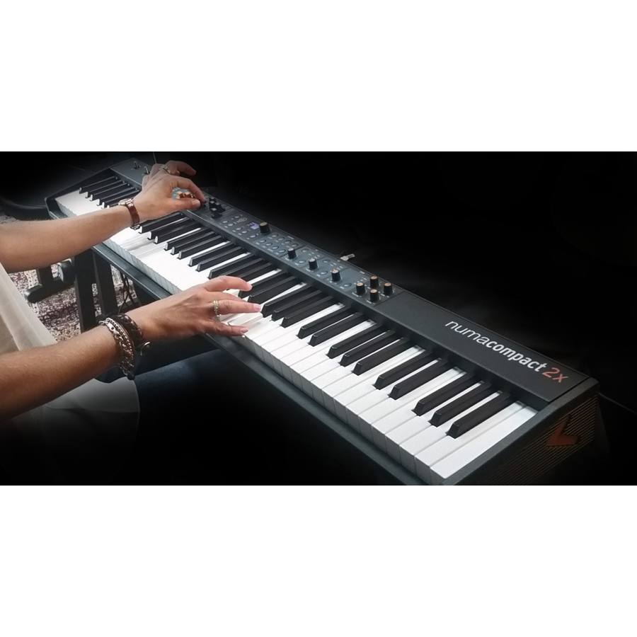 Numa Compact 2x include in un cabinet compatto e leggero un Keybed 88 semi pesato con aftertouch, un avanzato generatore sonoro di alta qualità che offre tre diversi sistemi di sintesi: Organo a modellazione fisica, Virtual analog, e Sample con 1 Giga RAM per suoni di piano acustico, elettrico, tastiera, ecc. I suoni solo elaborati da una avanzata sezione DSP che genera effetti di modulazione, ritardi, riverberi ed una sezione Mastering. Possiede inoltre funzionalità da MIDI controller, uno Speaker System, porte MIDI, USB sia MIDI che Audio. Una tastiera versatile in grado di supportare ogni tipo di attività musicale.