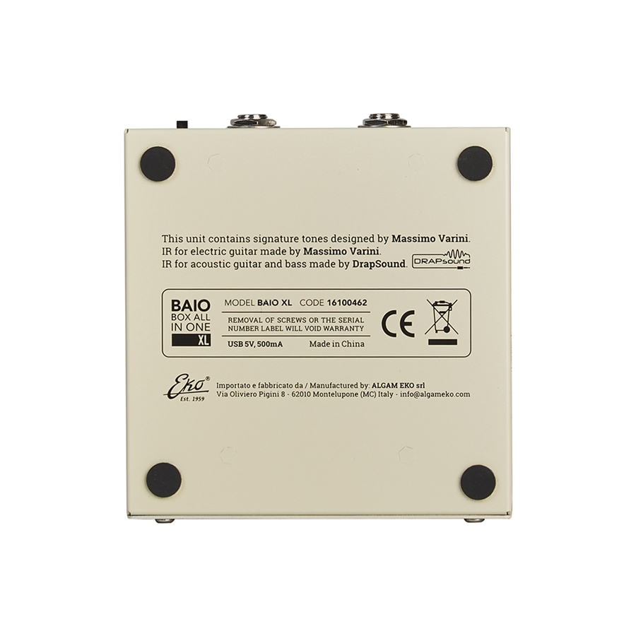 BAIO XL (Box All In One XL) è un pedale effetto portatile e multifunzionale per chitarra elettrica/acustica e basso. Dispone di 80 preset modificabili, l'utente può personalizzare la catena degli effetti e salvarla in preset. È dotato di batteria integrata, che può durare fino a 10 ore con una carica completa. BAIO XL ha 6 moduli di effetti, Noise Gate, Boost, Compressore, 20 preamplificatori, EQ a 3 bande, 7 modulazioni, 5 delay, 6 riverberi, 20 slot IR CAB e molto altro.