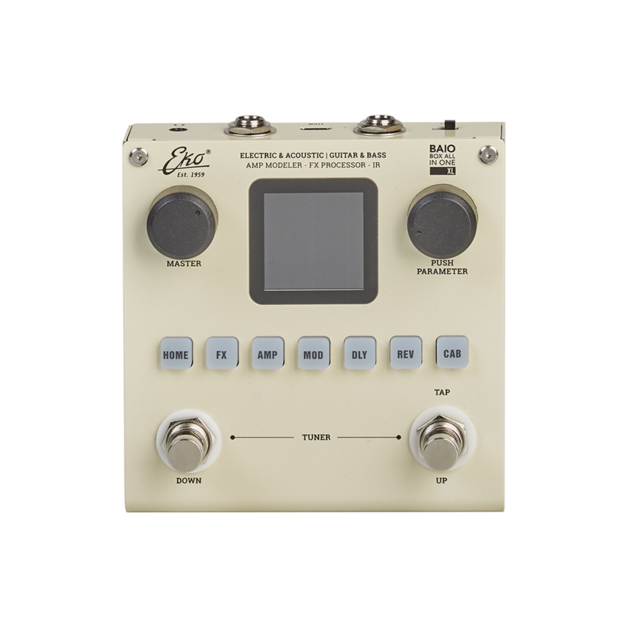 BAIO XL è il pedale multieffetto e IR loader per chitarra elettrica, acustica, classica e basso elettrico di Eko Guitars. Con display a colori e due footswitch, il BAIO XL propone 80 preset modificabili, 6 moduli di effetti, noise gate, boost, compressore, 20 preamplificatori, EQ a 3 bande, 7 modulazioni, 5 delay, 6 riverberi, 20 slot IR CAB e molto altro. È alimentato a batteria ricaricabile, dispone di ingresso Bluetooth, uscita cuffie, connessione USB-C per la ricarica e per il collegamento come interfaccia audio verso computer e smartphone. Al suo interno trovate impulse response realizzati da Drap Sound e Massimo Varini.