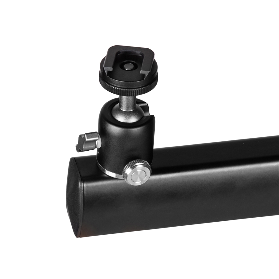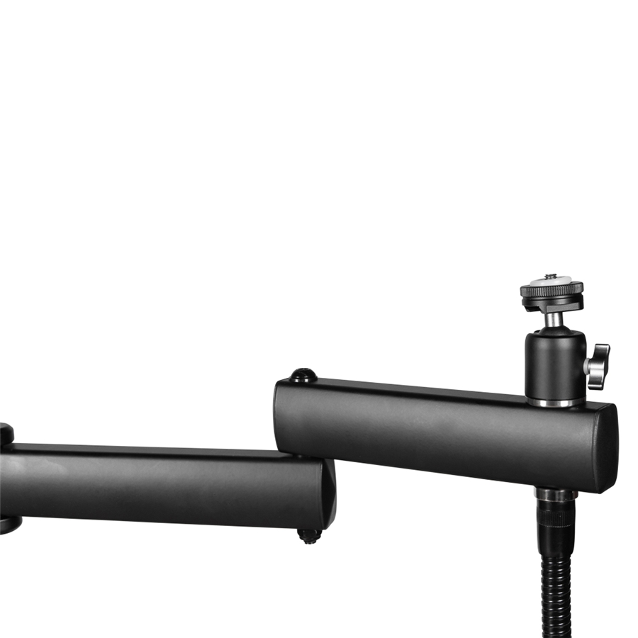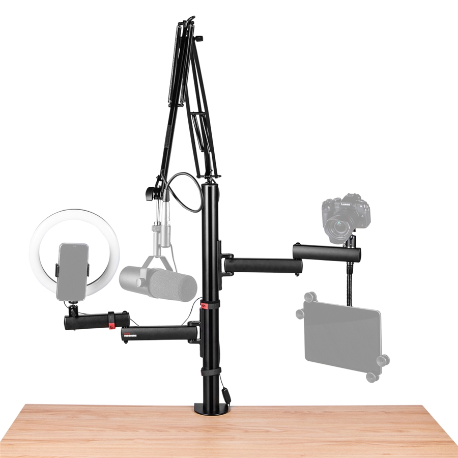 Progettato per integrarsi in modo ordinato e funzionale negli spazi ridotti di home studio e setup da streaming, questo stand all-in-one include tutto il necessario per live streaming, podcast, tutorial video e produzione di contenuti. Si fissa saldamente al bordo della scrivania grazie a un morsetto robusto e offre una struttura verticale con due bracci regolabili in altezza e rotazione, su cui montare microfoni, luci, smartphone e fotocamere.
