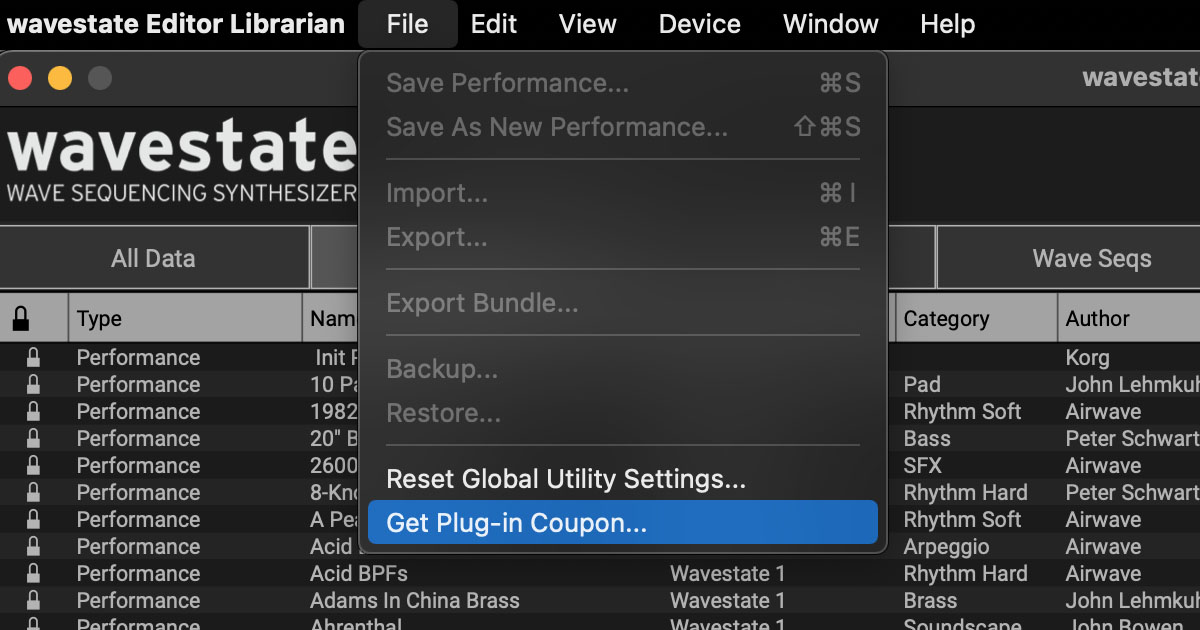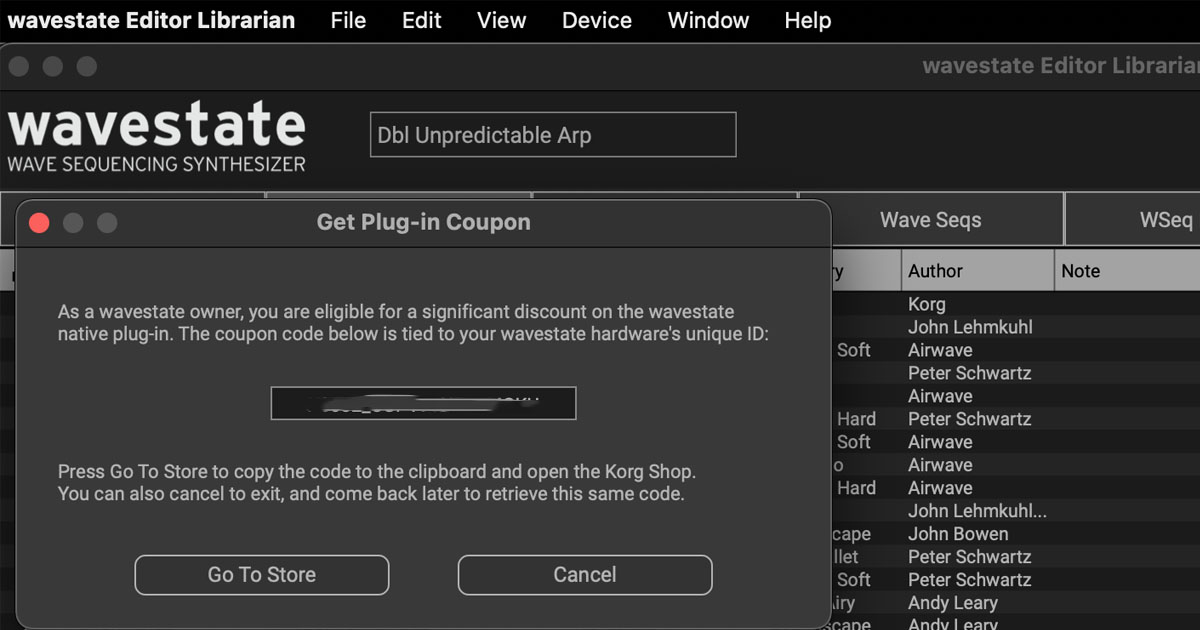 Una volta aggiornati il firmware e il software Editor/Sound Librarian, basterà connettere l’Opsix e/o il Wavestate hardware al vostro computer via USB, quindi aprire il software Editor/Librarian per poi andare nel menù file del medesimo e cliccare sull’ultima voce “Get Coupon Code”. Vi comparirà un pop-up con un codice che dovrete copiare e utilizzare successivamente nell’online store Korg al quale potrete accedere direttamente cliccando su “Go To Store”.